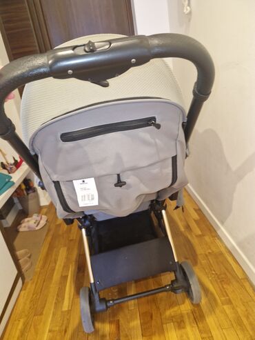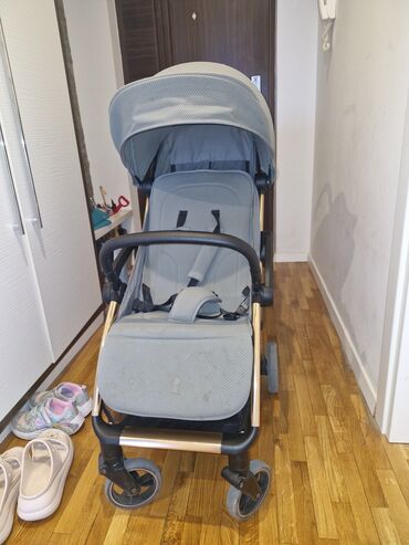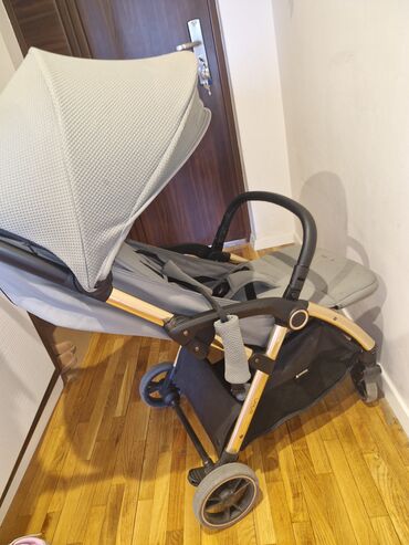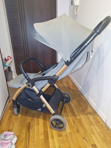Kompaktan gradski kišobran-kolica za bebe i malu decu, siva boja sa zlatnim/boja šampanjca ramom.