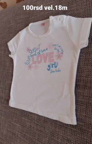 PamukDečija majica za devojčice, kratki rukav, bela. Veličina: 18M (za oko 18 meseci). Na prednjoj strani šara sa natpisima “LOVE”, “girls” i cvetićima u roze i plavoj boji. Okrugli izrez sa dva drikera na ramenu radi lakšeg oblačenja. Mekan, lagan pamučni materijal, ravni porubi na rukavima i dnu.