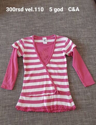 UpotrebljenоDečija majica/bluza sa dugim rukavima C&A (Palomino), veličina 110, za uzrast oko 5 godina. Model na preklop sa V-izrezom i ukrasnom trakicom/mašnicom sa strane. Spoljašnji sloj u roze‑beloj prugastoj kombinaciji, ispod ušiven tanji roze sloj sa diskretnim floralnim printom na grudima. Donji rub sa talasastim/volančić završetkom. Prijatna, meka pamučna trikotaža pogodna za svaki dan.