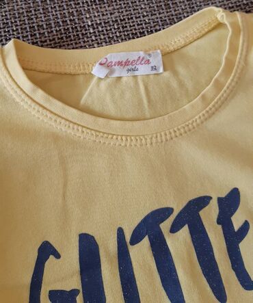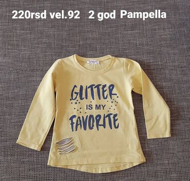 UpotrebljenоDečija majica dugih rukava Pampella (girls), veličina 92 (za oko 2 godine). Žuta boja, okrugli izrez, natpis napred “GLITTER IS MY FAVORITE” u tamnoplavoj boji sa sitnim zvezdicama. Asimetričan donji rub sa dekorativnim izrezima sa leve strane. Materijal mekog pamučnog tipa.