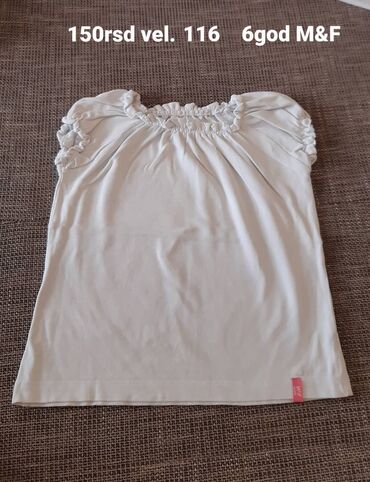 - Model: bela majica kratkih rukava sa naborima/žabicama oko okovratnika i ramena