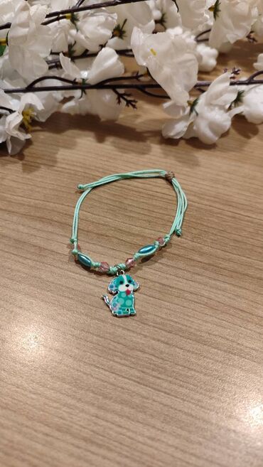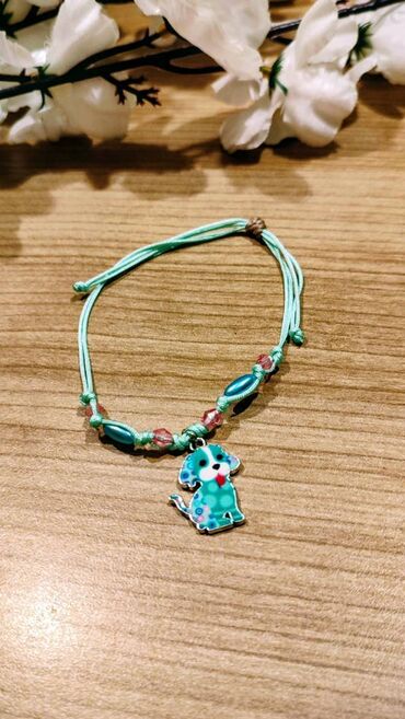 Narukvica sa podesivim koncem i privjeskom mačke - Ručno rađena narukvica od tankog, glatkog konca u svetloplavoj boji, duplog navoja. - Centralni privjesak: stilizovana mačka u tirkiznoj/akva nij...