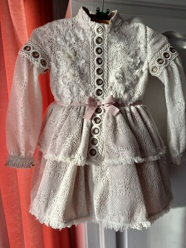 - Detalji: dekorativno kopčanje dugmićima duž prednjeg dela i na rukavima, aplikacije cvetića sa bisernim perlama na prsima, resice na rubovima slojeva suknje