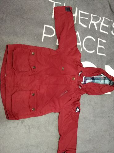 Dečija zimska jakna, crvena, sa kapuljačom i toplom postavom. Model sa punjenjem u „puffer” stilu, zatvaranje na čvrst rajsferšlus celom dužinom. Dva spoljašnja džepa sa rajsferšlusima. Rukavi sa e...