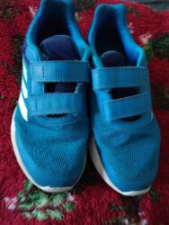 Dečije patike Adidas, broj 34 (EU). Model sa dvostrukim čičak trakama za lako obuvanje i dobro prilagođavanje stopalu. Gornjište od prozračne mrežice u plavoj boji sa karakteristične tri bele Adidas pruge sa strane. Mekana unutrašnjost, jezik sa etiketom: US 2.5 / UK 2 / FR 34 / JP 210 / CHN 210; proizvedene u Vijetnamu, oznaka SHD 657005 (12/21). Đon je fleksibilan sa mrežastim šarama za dobro prianjanje. Cena: 1000 din.