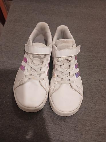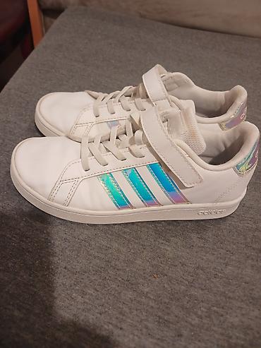 Dečije patike Adidas, plave boje sa belim prugama. - Model sa dva čičak-traka (velcro) za lako obuvanje i dobro prijanjanje. - Veličina: EU 30 (US 12K, UK 11½K, JP/CHN 180) – vidljivo na etiketi. -...