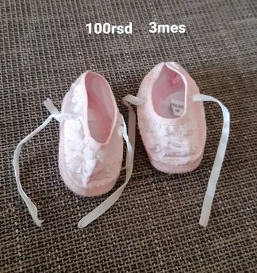 Roze bebine baletanke/cipele za novorođenče (0–3 meseca). - Materijal: nežni satenski izgled sa čipkanim detaljima. - Dekor: bele čipkaste ivice i sitne izvezene aplikacije, mašnice napred. -...