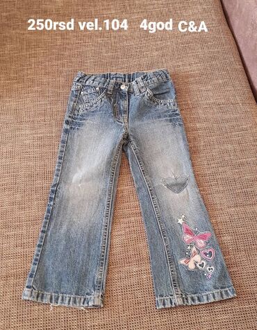 Dečije farmerke C&A, veličina 104 (za oko 4 godine). Klasičan plavi teksas sa blagim izbeljenim efektom. Model sa širim nogavicama, pet džepova i petljama za kaiš. Kopčanje na dugme i rajsferšlus. ...