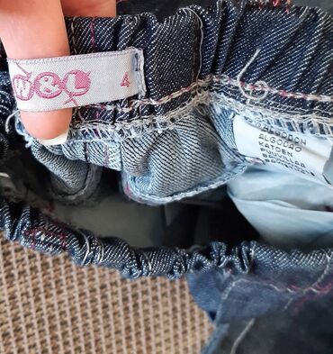 Dečije farmerke W&L, veličina 104 (za oko 4 godine). Tamni teksas sa blagim izbeljenjima napred i crvenim dekorativnim šavovima. Elastičan struk za udobno nošenje, prednji ušiveni nabori i dva bočna džepa. Na zadnjim džepovima štampa sa motivima i natpisima (Just Marine, Ocean Angels, UPM Girl). Sastav prema etiketi: pamuk (algodón/cotton). Na fotografiji je naznačena cena: 250 rsd.