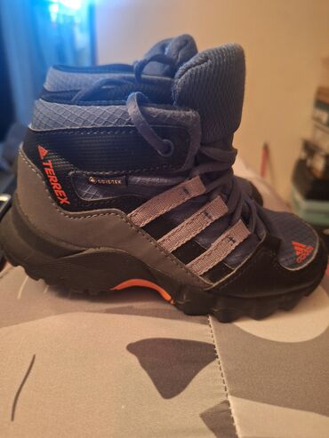- Adidas Terrex dečije planinarske cipele sa vezivanjem. Model sa srednje visokim gornjištem za bolju stabilnost članka. Materijali: kombinacija mrežastog i sintetičkog tekstila sa ojačanjima od veštačke kože. Gore‑Tex membrana (etiketa na boku) – vodootporne i prozračne. Profilisan, dubok gumeni đon sa agresivnim kramponima za dobro prianjanje na mokrim i neravnim podlogama. Boja: tamno plava/siva sa crvenim detaljima i Adidas/TERREX logotipima.