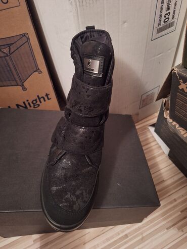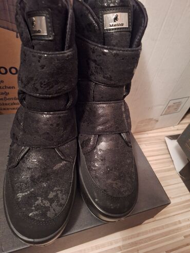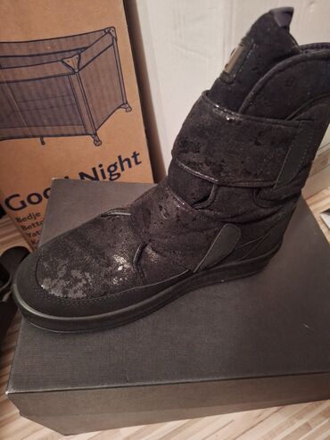 - Crne zimske čizme sa sjajnim/štras efektom na gornjištu. Zatvaranje na široke čičak trake za lako obuvanje i dobro pristajanje. Mekano postavljen jezik i okovratnik, ravna gumena podloga. Dekorativna pločica s logotipom na jeziku. Idealne za hladno vreme i gradske uslove.