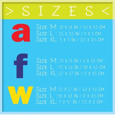 - Veličina XL: npr. “a” 12,5 x 12,5 cm; “f” 17 x 9,5 cm; “w” 17,5 x 12 cm.