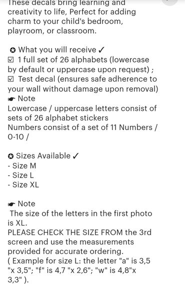 - Napomena: Slova na prvoj fotografiji su veličine XL. Velika slova se poručuju na zahtev kao set od 26 nalepnica. Brojevi su zaseban set od obicno 11 komada (0–10).