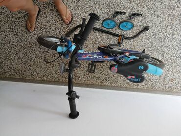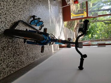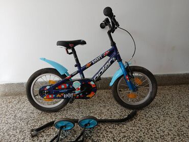 Dečiji bicikl sa pomoćnim točkićima - Veličina točkova: 16" - Čelični ram sa gornjom cevi u crno‑belom dizajnu sa plavim detaljima - Prednja i zadnja blatobranska krila - Lanac i pogon zaštićeni p...