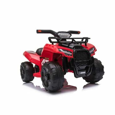 Dečiji električni ATV u crvenoj boji, dizajniran za vožnju na četiri točka. Poseduje prednje svetlo za bolju vidljivost. Vozilo je opremljeno izdržljivim točkovima koji obezbeđuju stabilnost na različitim površinama. Crne zaštitne šipke na prednjem delu dodaju sigurnost i robustan izgled. Idealno za zabavu na otvorenom.