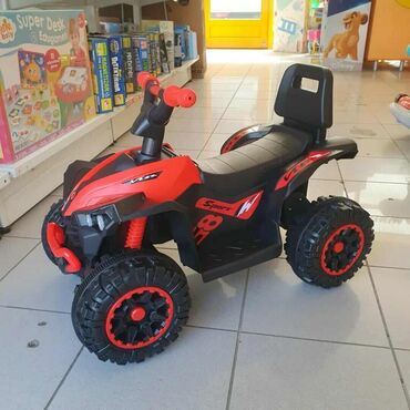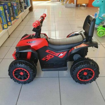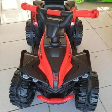 Dečiji električni kvad u crno-crvenoj kombinaciji boja, dizajniran za vožnju sa četiri točka. Poseduje udobno sedište i visoki naslon za leđa, pružajući stabilnost i sigurnost tokom igre. Vozilo je opremljeno robusnim točkovima sa šarom za dobro prianjanje na različitim površinama. Upravljač je širok sa neklizajućim ručkama za lako manevrisanje. Prednji deo kvada ima stilizovane elemente koji podsećaju na farove, dok su bočne strane ukrašene grafikama i natpisom „SPORT“, što mu daje atraktivan izgled. Ovaj kvad je pogodan za avanturističku igru na otvorenom, omogućavajući deci da razvijaju motoričke sposobnosti i koordinaciju.