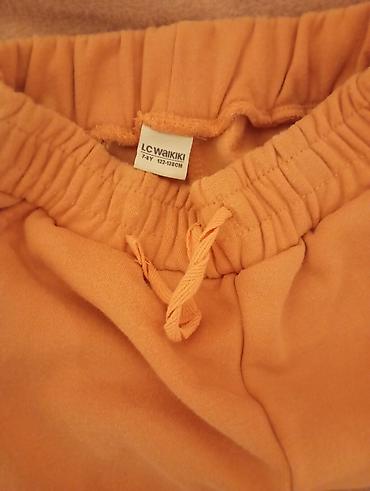 - Donji deo: LC Waikiki donji deo trenerke, veličina 7–8Y (122–128 cm). Boja breskva/narandžasta. Elastičan pojas sa učkurom za podešavanje, bočni džepovi, ranfle na nogavicama. Mali našiveni bedž pri dnu nogavice.