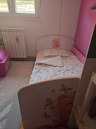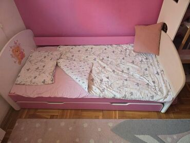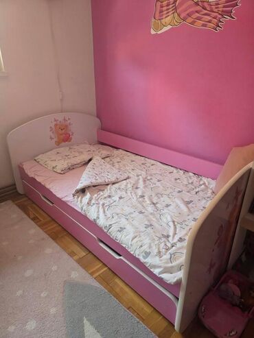 Drveni kreveti sa dusekom i velikom fiokom za odlaganje - Materijal: drvo/iverica u toploj boji bukve, zaobljene ivice i uzglavlje/uznožje sa zaštitnim bočnim stranicama. - Dimenzije ležajne površ...