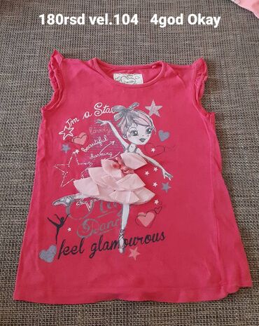 Predstavljamo dečiji roze top bez rukava marke Okay, veličine 104. Izrađen je od pamuka, što ga čini udobnim za nošenje. Na prednjoj strani se nalazi aplikacija balerine sa detaljima u obliku srca i zvezda, uz natpise koji dodaju šarm. Rukavi su blago nabrani, dajući dodatni stilski detalj. Pogodan je za svakodnevno nošenje, igru ili posebne prilike za devojčice.