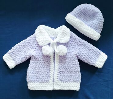 - Mekani kompleti kapica + jaknica od plišane pređe u lila-beloj kombinaciji, sa kragnom, obrubima i ukrasnim pomponima.