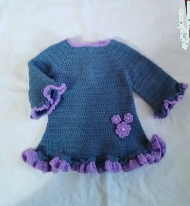 - Heklana haljinica u teget/sivkastoj nijansi sa ljubičastim volanima i cvetićima sa perlicama.