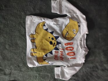 - Bela majica dugih rukava sa printom žutog dinosaurusa i natpisima “BOO!” i “FUNNY DINO”; okrugli izrez.