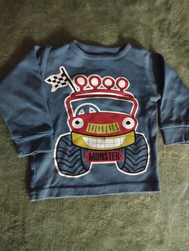 - Plava majica dugih rukava sa velikim printom crvenog monster trucka, kariranom zastavicom i natpisom “MONSTER”; mekana pamučna trikotaža, okrugli izrez.