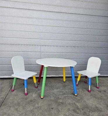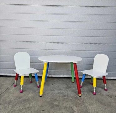 - Dimenzije (procena sa fotografija): sto niskog profila sa okruglom pločom; stolice dečije visine, prikladne za predškolce.