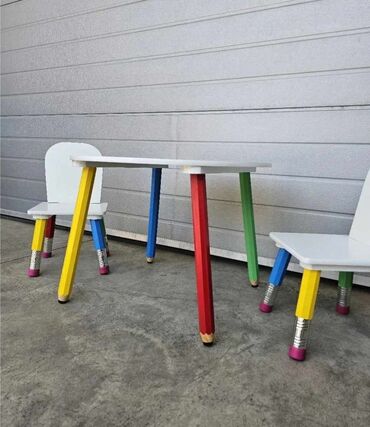 - Noge stola i stolica oblikovane kao velike drvene bojice u živim bojama (žuta, crvena, plava, zelena), sa detaljima „gumice“ i „vrha olovke“.