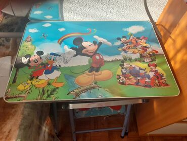 - Površina stola u jarkim bojama sa velikim ilustracijama Mikija, Paje Patka i prijatelja; ivice stola oborene i zaobljene radi bezbednosti