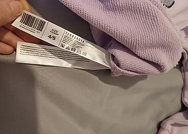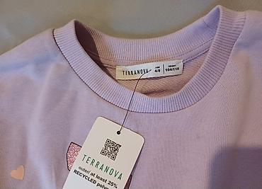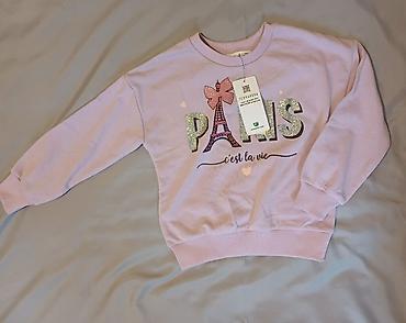 Dečji dukser (duks) Terranova, model za uzrast 4–5 godina (visina 104/110). Boja: svetloljubičasta (lila). Prednja strana sa šljokičastim printom “PARIS” i Ajfelovom kulom, detalji u obliku mašnice i srca, natpis “c’est la vie”. Klasičan okrugli izrez, duži rukavi sa ranflama, ranfla na struku. Materijal: 73% pamuk, 27% poliester; spoljni deo sadrži najmanje 25% recikliranog poliestera (oznaka na etiketi). Mekana, brušena unutrašnjost za udobnost. Idealan svakodnevni komad za devojčice koje vole nežne boje i pariske motive.