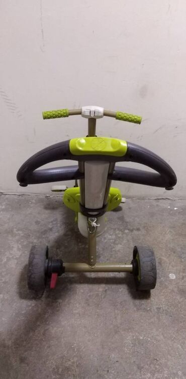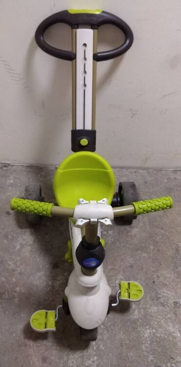 ZelenaDeciji tricikl ,duz.oko 70,sir.oko 40vis.sedista oko 32 cm. sa nogostupima,ne postoji mogucnost upravljanja zadnjom rucicom,samo guranje,podesiva originalna rucica visina 72-102 cm.postoji kocnica.