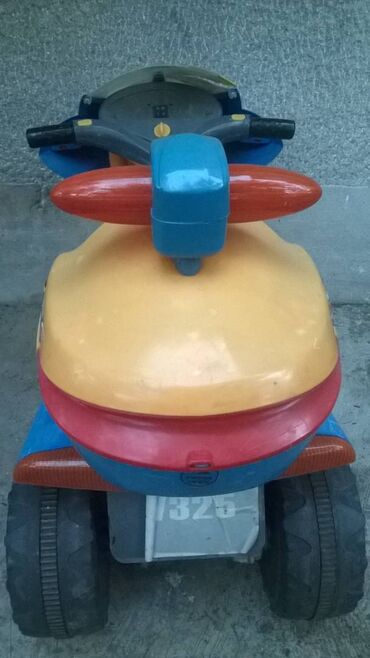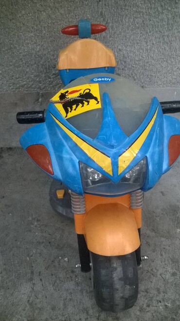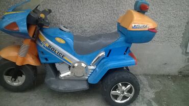 Deciji tricikl na akumulator 6 V veliki, polovan, precnik tocka 25, duz. 110, vis. volana 55, a sedista 44 cm. , bez punjaca.NEIspravan aku ,ispravan motor i prekidaci, ali ide samo napred ,svetle samo pr.zmigavci, ostalo nije spojeno. Naprslo pr. staklo.