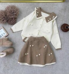 - Bež set sa kardiganom: kontrast kragna u krem boji, dekorativna čipkana traka uz dugmad, elastičan struk na suknji, diskretan krem obrub.