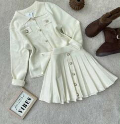 - Bež set sa mašnicom: teksturirani džemper sa reljefnim uzorkom i 3D mašnicom u krugu, klasična bela kragna, plisirana suknja sa krem ivicom.