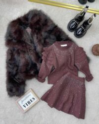 - Bordo set sa sjajnim detaljima: džemper sa karnerima na ramenima i sitnim sjajnim aplikacijama po celoj površini; suknja sa usklađenim detaljima.
