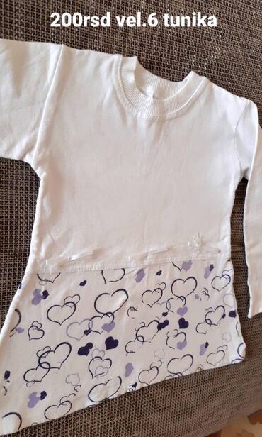 Dečja tunika, veličina 6. Belo gornjište sa dugim rukavima i okruglim rebrastim okovratnikom; donji deo A-kroja sa dezenom srca u ljubičastim i tamnim nijansama. Na prelazu između gornjeg i donjeg dela nalazi se diskretna ukrasna traka/mašnica. Materijal je mekan i prijatan, idealan za svakodnevno nošenje.