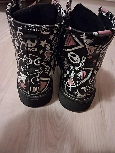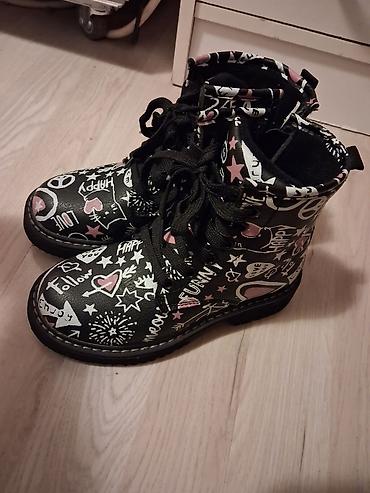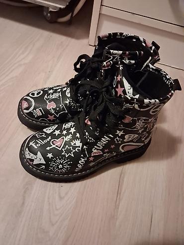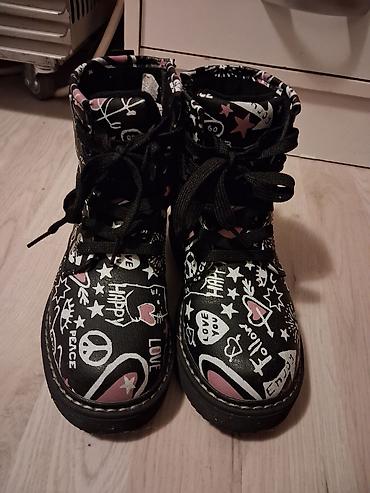 Dečje čizme sa pertlama, crne sa šarenim printom (beli i roze motivi: zvezde, srca, natpisi “LOVE”, “HAPPY”, “PEACE”, “FOLLOW”, vatrometi, mačkica i simbol mira).