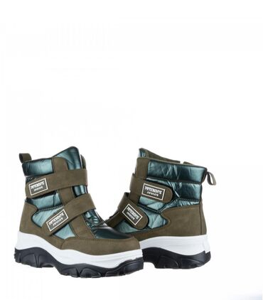 - Topla, visokoprofilna zimska čizma sa modernim sjajnim panelima u zelenoj nijansi i mat segmentima u maslinasto‑braon boji