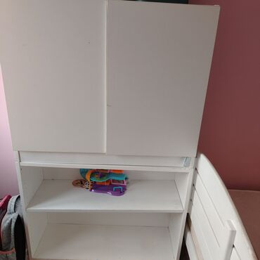 - Dodatno: beli višenamenski ormarić/polica sa dvoja gornja vrata i dva otvorena nivoa ispod, pogodan za odlaganje knjiga, igračaka ili posteljine.