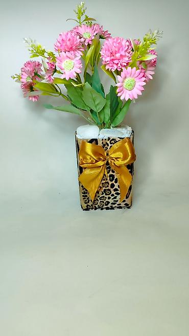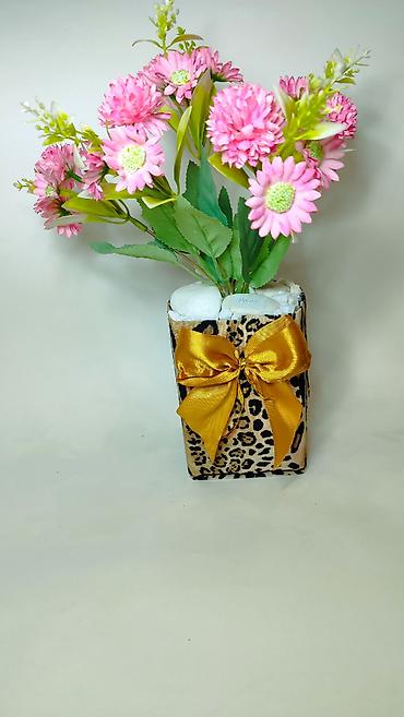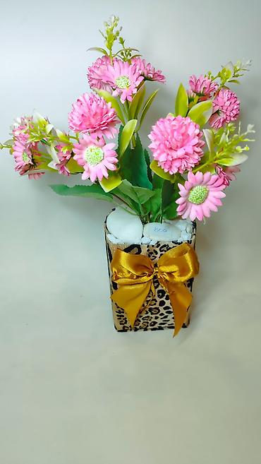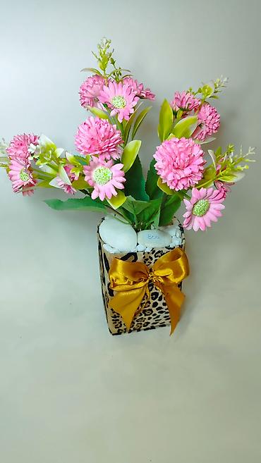 Materijali: plastika/tekstil (cveće i lišće), veštački kamenčići, dekorativna saksija sa printom, satenska traka.
