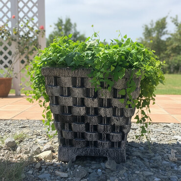 Dekorativna betonska žardinjera – kvadratnog oblika sa efektnim „pletenim“ reljefom.