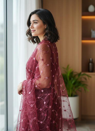 - Materijal: fina providna organza sa diskretnim satenastim odsjajem