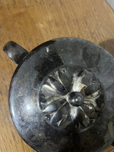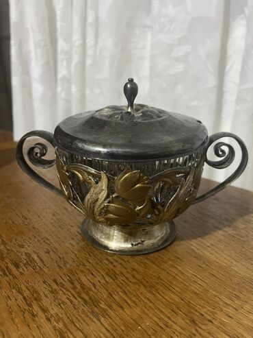 - Elegantna činija sa dva bočna uvijena drška i metalnim poklopcem sa ručkicom.