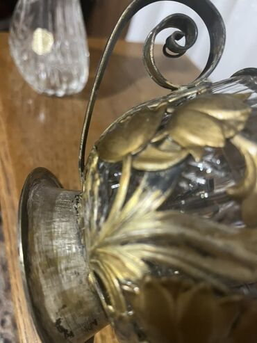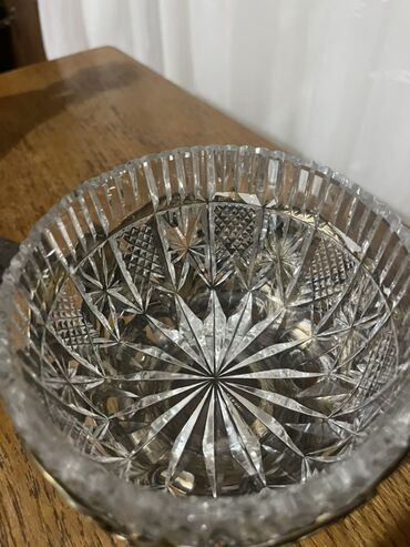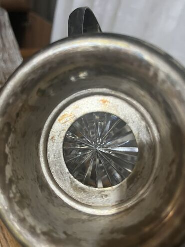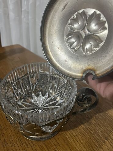 - Unutrašnja posuda od brušenog kristala, bogatog geometrijskog reza (zvezdasti motiv na dnu, rebrasti rub).