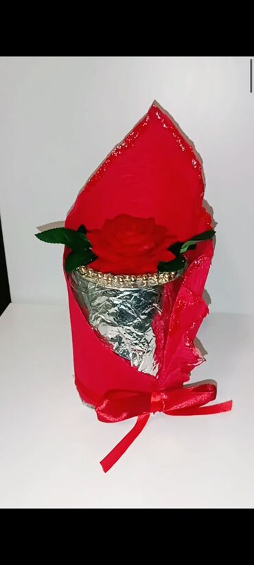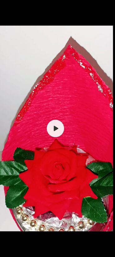 - Spoljašnje pakovanje od crvenog krep papira sa sjajnim detaljima i satenskom mašnom.