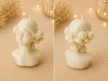 - Ručno izlivena skulpturalna sveća u obliku ženske biste sa zatvorenim očima i detaljno modelovanim ružama oko kose i potiljka.