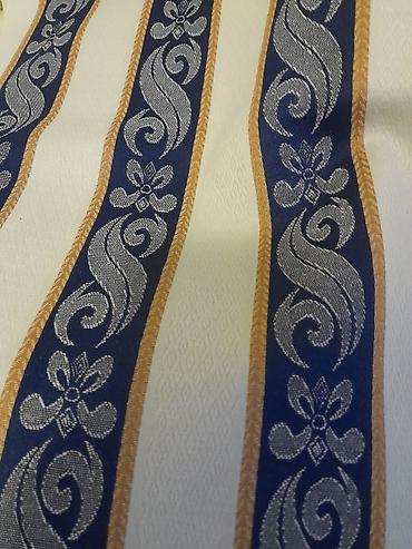 - Širina pruge (okvirno): tamnoplava traka sa motivima srednje širine, razdvojena krem zonama; ritam pruga ujednačen duž cele tkanine.