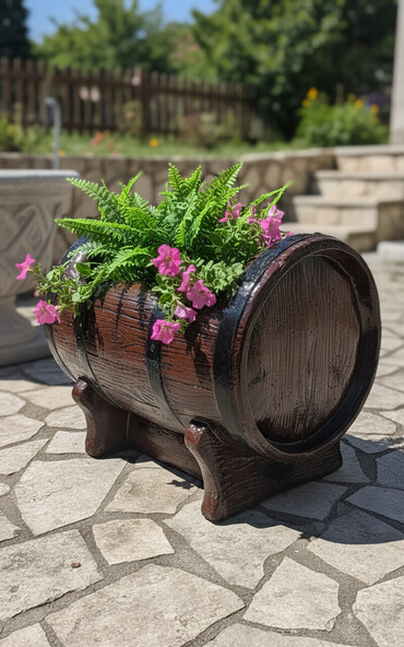 Dekorativna žardinijera u obliku drvene bačve.