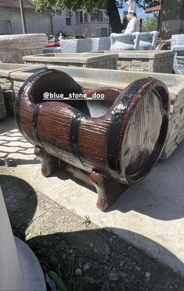 - Materijal: veštački kamen/beton, ručno obrađena površina sa imitacijom drveta i metalnih obruča.